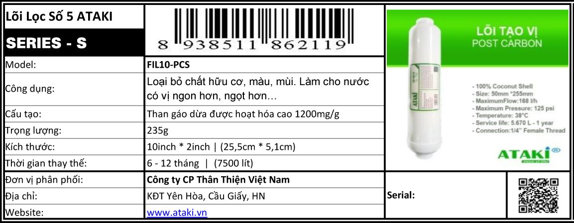 Lõi lá»c nước số 5 than hoạt tính T33 ATAKI